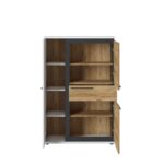 Комод Salinas має нестандартне розташування полиць, представляючи як широкі, так і вузькі простори для облаштування. Він оснащений одним висувним ящиком, стильно інтегрованим у компонування фасадів. Виготовлений з ламінованого ДСП, сучасний комод вражає своєю асиметричною системою дверей, оснащеною безшумним закриванням, і дизайном, який підходить як для сучасного, мінімалістичного, так і для індустріального інтер’єру. Мінімалістичні горизонтальні ручки з пластику надають неповторного ефекту.