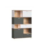 Книжкова шафа виготовлена з ламінованого ДСП, в ній представлені модні кольори, вміло поєднані в композицію альпійського білого, сірого графіту з відтінком натурального дерева (дуб Кастелло Медовий). Предмет меблів чудово впишеться в молодіжну кімнату, оформлену в сучасному стилі, або в індустріальний інтер’єр. Книжкова шафа поставляється в упаковках для самостійної збірки, можна купити світлодіодне освітлення. Меблі необхідно кріпити до стіни.