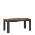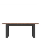 Ефектний, масивний розсувний стіл з прямокутною стільницею, виконаний в синхронній структурі з натурального дерева, має ніжки та елементи каркаса кольору антрацит. Ідеальне поєднання кольорів дуба Амаретто та антрациту створило вічний, винятково елегантний ефект. Виготовлені з високоякісного ламінованого ДСП, меблі зберігають зовнішній вигляд дерев’яних кілець завдяки технології виробництва деревної плити. Розкішний візуальний ефект природного матеріалу разом з кольоровою гамою дозволяє адаптувати стіл до просторої їдальні та вітальні, оформленої в сільському, колоніальному або лофтовому стилях.