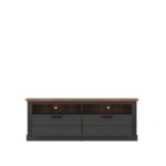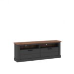 Комод RTV з двома висувними ящиками, виготовлений з ламінованої ДСП з видимим деревним відтінком, оснащений двома відкритими полицями, для яких у задній частині меблів залишили отвори для проводів. Завдяки цьому комод ідеально підходить для демонстрації електронної техніки. Солідність виготовлення підсилюється масивною формою меблів і поєднанням антрацитового кольору з деревним відтінком, використаним для верхньої частини комода (колір дуба Амаретто Хадсон). Меблі мають стандартні розміри, завдяки чому їх легко вписати в інтер’єр кімнати.