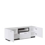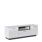 Електронне обладнання можна розмістити на стільниці або повісити над комодом. Внутрішня частина комода має глибоку шухляду та полички за закритими фасадами. Тумба оснащена петлями з м’яким закриттям та металевими ручками.
