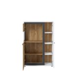 Лівостороння асиметрична вітрина зі склінням, доступна в колекції Salinas, – це предмет меблів, виготовлений зі стійкого до пошкоджень і подряпин ламінованого ДСП і сірого загартованого скла. Асиметрична вітрина має місткі полиці, а її привабливий вигляд доповнюють помітні бордюри контрастного відтінку та горизонтальні ручки з пластику. Корпус доступний у альпійському білому кольорі з матовими чорними вставками, тоді як фасади в модному відтінку дуба Катанія / альпійського білого.
